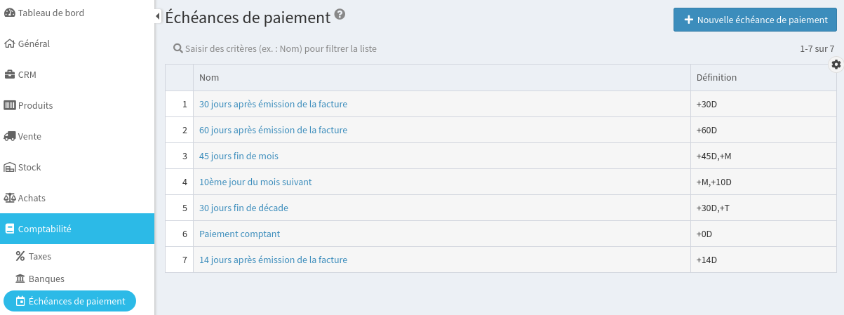 Rendez vous dans le module . Sur cette page, vous pouvez définir les échéances de paiement de vos factures de vente.